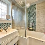FAMILY BATHROOM 10' 0" max x 5' 5" (3.05m x 1.65m) fitted with a white suite comprising of a low level wc; vanity wash hand basin with mixer tap and storage cupboard; p-shaped panelled bath with mixer tap and shower over; two UPVC double glazed windows to rear; heated towel rail radiator.
