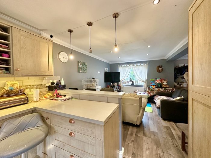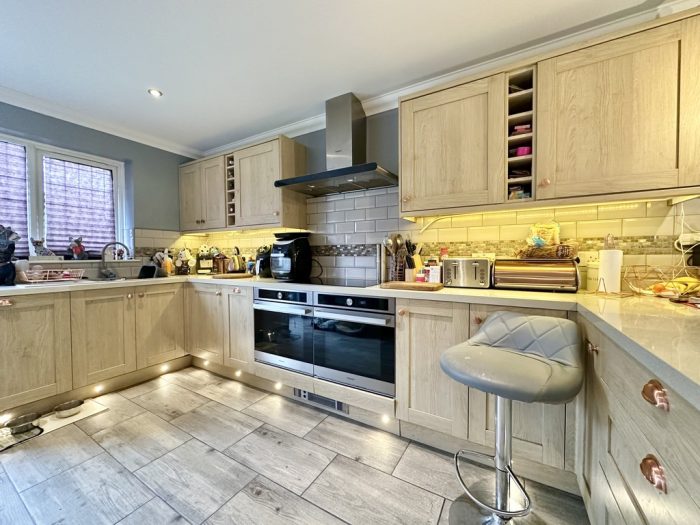 OPEN PLAN KITCHEN / LIVING SPACE 27' 3" x 10' 7" (8.31m x 3.23m) UPVC double glazed windows to front and rear aspects; kitchen area is fitted with a range of modern wall and base units with square edge worksurfaces over; inset one and a half bowl sink with mixer tap; integrated dishwasher, fridge and freezer; built in microwave; bank of two built in electric ovens; inset electric hob with cooker hood over; tiled splashbacks; UPVC double glazed door to rear.