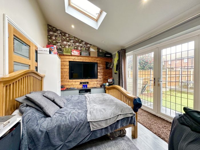 BEDROOM 6 / CINEMA ROOM 17' 7" x 9' 8" (5.36m x 2.95m) UPVC double glazed French door to rear flanked by two full height UPVC double glazed windows to rear; walk in cupboard measuring 8' 9" x 4' 6" max with two roof light windows to rear.