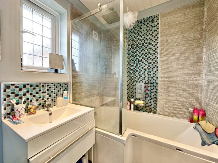 FAMILY BATHROOM 10' 0" max x 5' 5" (3.05m x 1.65m) fitted with a white suite comprising of a low level wc; vanity wash hand basin with mixer tap and storage cupboard; p-shaped panelled bath with mixer tap and shower over; two UPVC double glazed windows to rear; heated towel rail radiator.