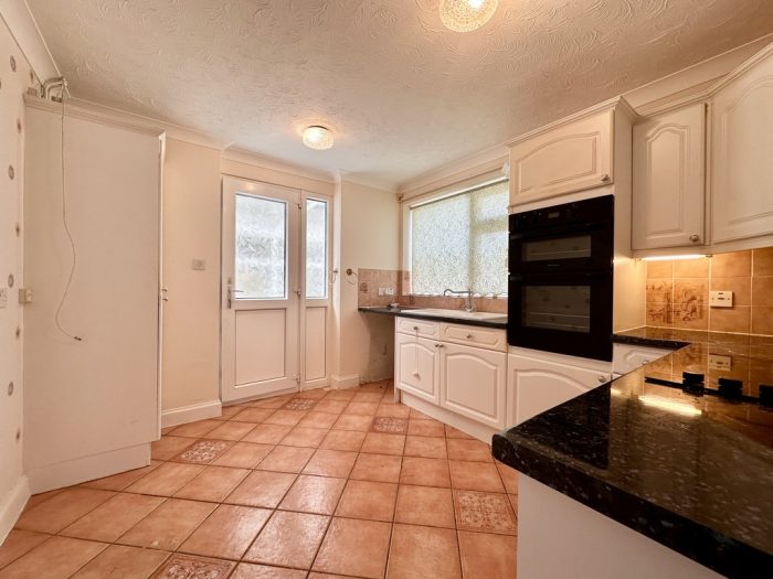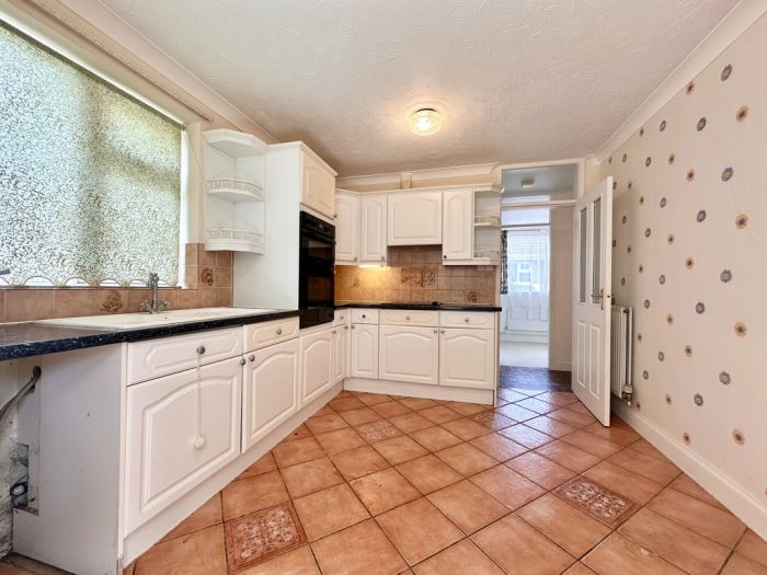 KITCHEN 11' 2" x 10' 2" (3.4m x 3.1m) l-shaped worktop with a range of base cupboards and drawers; space and plumbing for washing machine; one and a half bowl sink with mixer tap; eye level oven and grill; four ring hob; range of wall units including end shelf display units; space for fridge freezer; further unit housing integrated freezer; window to front aspect; radiator; tiled flooring; UPVC side door to Side Porch.
