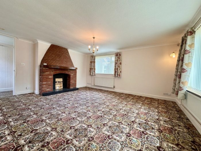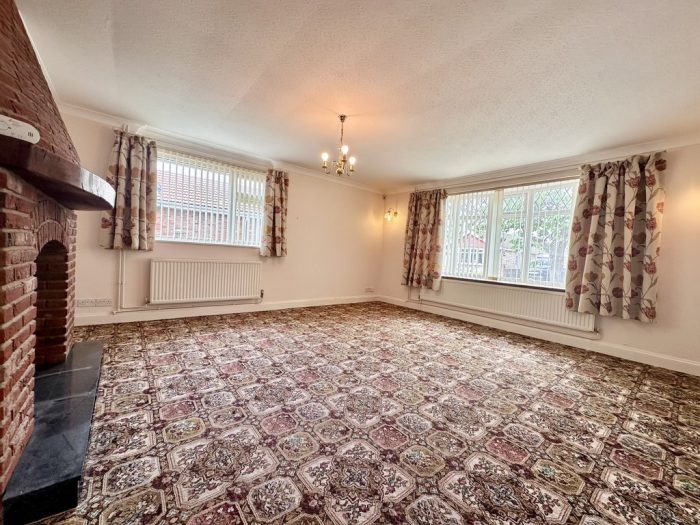 LOUNGE 18' 6" max x 16' 0" (5.64m x 4.88m) bow bay window to front aspect; further side window; feature brick fireplace; two radiators; wall lights.