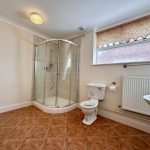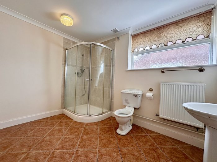SPACIOUS SHOWER ROOM large shower cubicle with mains shower fittings; wc; pedestal wash hand basin; frosted window; radiator.