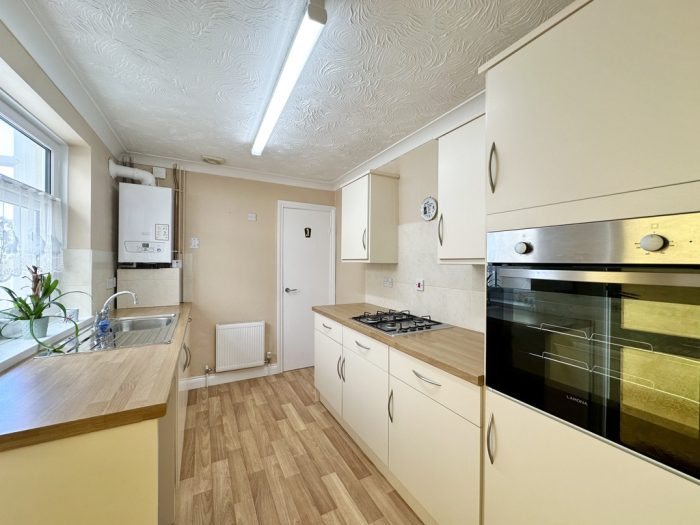 KITCHEN 10' 10" x 7' 4" (3.3m x 2.24m) fitted with a range of wall and base units with roll edge worksurfaces over; inset stainless steel single drainer sink with mixer tap; wall mounted gas fired central heating boiler; tiled splashbacks; inset gas hob; built in electric oven; plumbing for automatic washing machine.