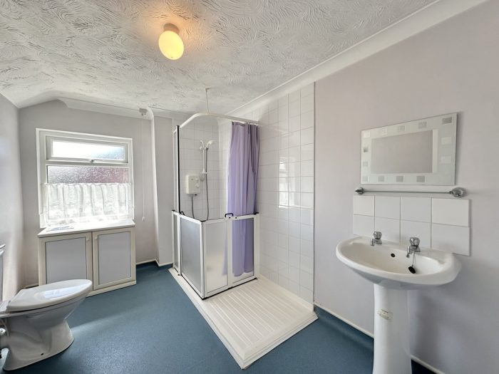 SHOWER ROOM 10' 11" x 7' 7" (3.33m x 2.31m) fitted with a white suite comprising of a low level wc; pedestal wash hand basin; walk in shower with wall mounted electric shower unit; tiled splashbacks; UPVC double glazed window to rear; extractor fan.