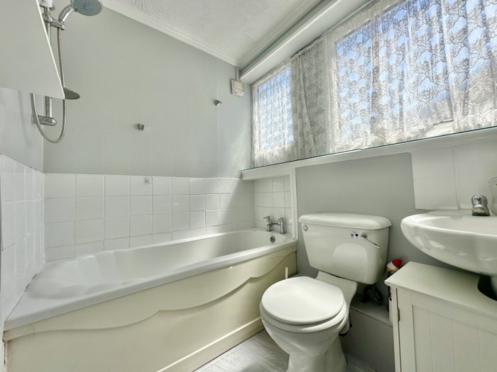 BATHROOM 7' 3" x 4' 11" (2.21m x 1.5m) fitted with a white suite comprising of a pedestal wash hand basin; low level wc; panelled bath with mixer tap and wall mounted electric shower unit over; tiled splashbacks; two UPVC double glazed windows to rear.