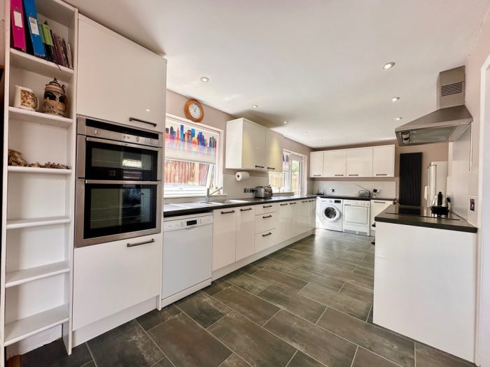 KITCHEN / DINER 30' 11" max x 8' 10" (9.42m x 2.69m) fitted with worktops and base cupboards and drawers; space and plumbing for dishwasher; Bosch washing machine; AEG tumble dryer; space for upright fridge freezer; eye level oven; four ring induction hob with light and extractor; one and a half bowl sink with mixer tap; good range of wall units; open front shelved unit; two radiators; windows to front and side aspects; side door; downlights.