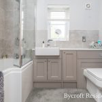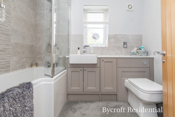 BATHROOM 8' 1" x 5' 7" (2.46m x 1.7m) fitted with a stylish modern bathroom suite comprising a low level wc; vanity wash hand basin with mixer tap over; fitted cupboards and quartz stone top; p-shaped panelled bath with mixer tap with wall mounted shower unit over, shower screen; tiled splashbacks; extractor fan; heated towel rail/radiator; upvc double glazed window to rear.