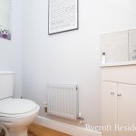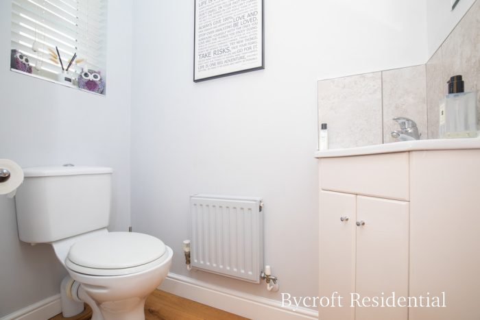 CLOAKROOM 5' 5" x 2' 10" (1.65m x 0.86m) white suite comprising a low level wc; corner vanity wash basin; tiled splashbacks; upvc double glazed window to front.