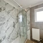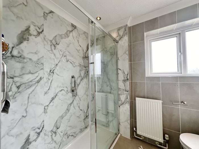 SHOWER ROOM 7' 3" x 5' 9" max (2.21m x 1.75m) fitted with a white suite comprising of a vanity wash hand basin with mixer tap and storage cupboards; low level wc; walk in shower cubicle with sliding door, aquaboard wall coverings and wall mounted shower unit; fully tiled walls; wall mounted cabinet; UPVC double glazed window to side.