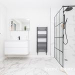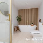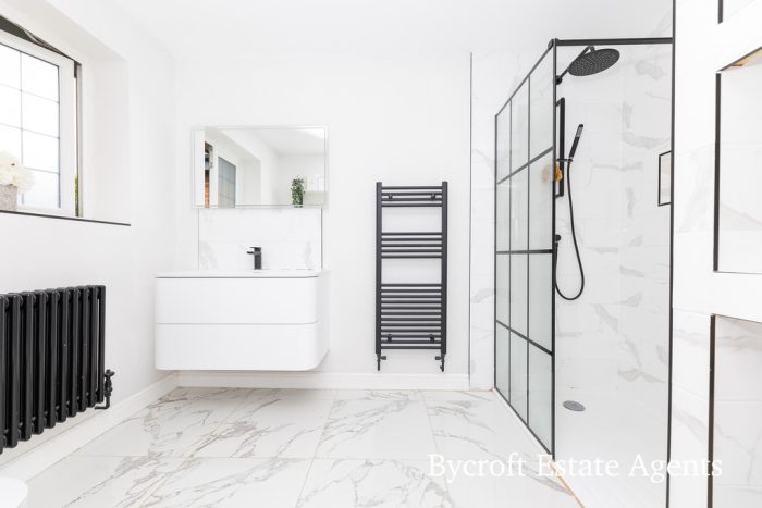 BATHROOM 11' 7" x 7' 9" (3.53m x 2.36m) fitted with a white suite comprising vanity wash hand basin with mixer tap over and storage cupboards below; low level wc; freestanding bath with freestanding mixer shower over. Walk-in shower cubicle with sliding shower screen door, wall mounted shower unit with hand and soaker attachment; built-in bathroom television; heated towel rail/radiator; upvc double glazed window to front.