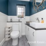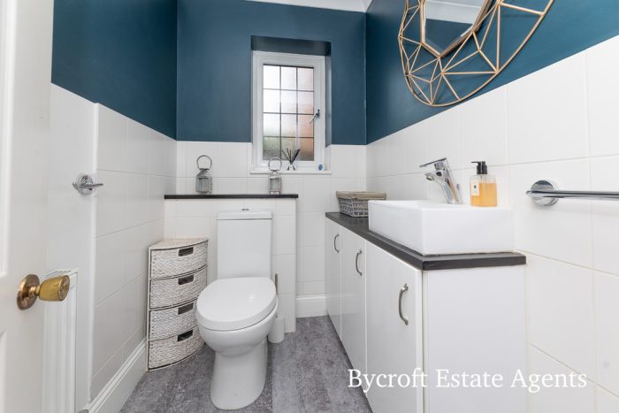 CLOAKROOM 6' 5" x 4' 6" (1.96m x 1.37m) fitted with a white suite comprising of a low level wc; vanity hand wash basin with mixer tap over and storage cupboard bellows; tiled splashbacks; upvc double glazed window to side.