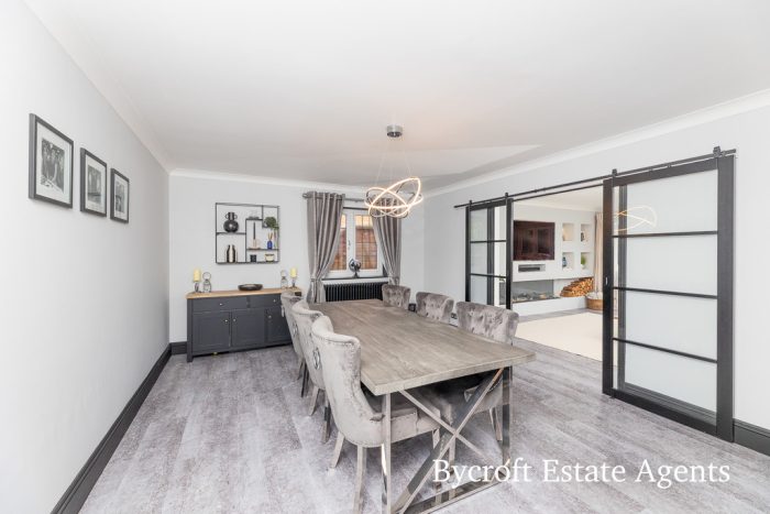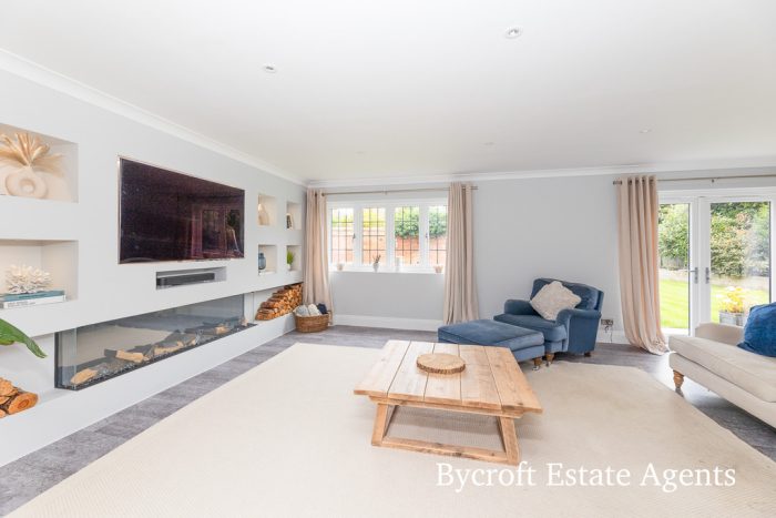 SITTING ROOM 23' 4" max x 15' 7" max (7.11m x 4.75m) upvc double glazed French door to rear; upvc double glazed window to rear; recessed media wall with inset shelving and feature fireplace.