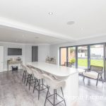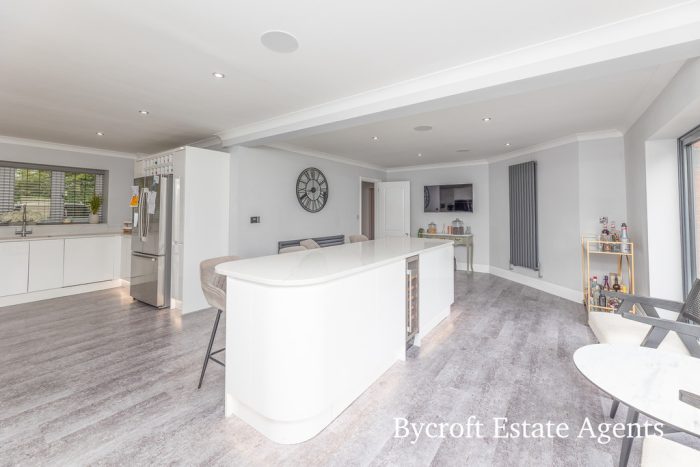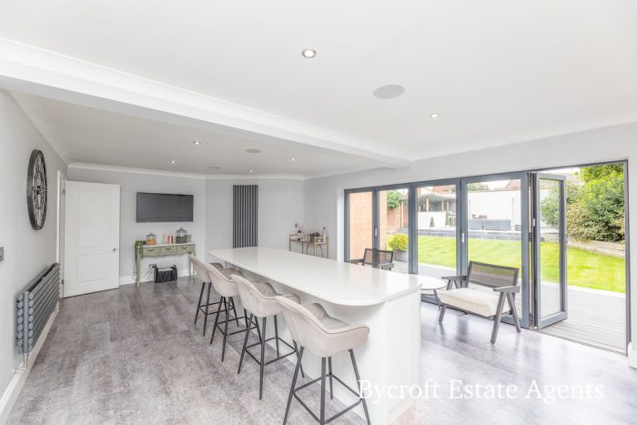 KITCHEN/DINER 25' 6" max x 23' 11" max (7.77m x 7.29m) fitted with a range of wall and base units with a granite worksurface over; recessed stainless steel sink with directional mixer tap over; inset induction hob with cooker hood over; space for American style fridge/freezer; bank of ovens including two slide and hide fan ovens and microwave; integrated dishwasher; central island unit; wine cooler and breakfast bar area. Contemporary style radiators; upvc double glazed window to front; aluminium anthracite bi-folding doors to rear; recessed ceiling speaker system.
