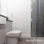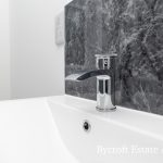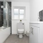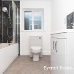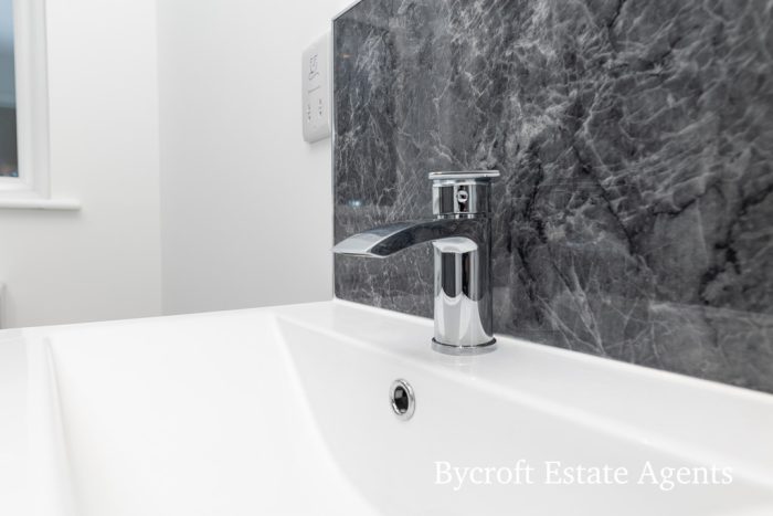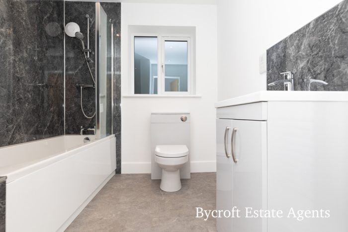 FAMILY BATHROOM fitted with white suite comprising of a vanity wash hand basin with mixer tap and storage cupboards; low level wc; panelled bath with mixer tap, shower screen and wall mounted shower unit over; aquaboard splashbacks; heated towel rail radiator; shaver point; UPVC double glazed window to side.