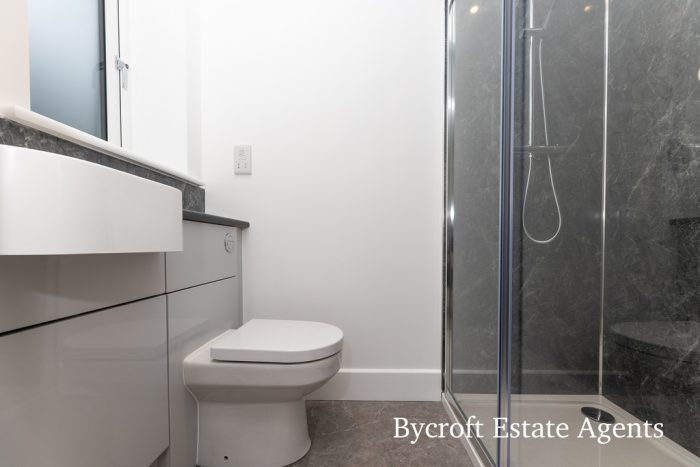 EN SUITE fitted with a white suite comprising of a vanity wash hand basin with mixer tap and storage cupboards; low level wc; walk in shower cubicle with sliding door, wall mounted shower unit with hand and soaker attachments; aquaboard wall covering and splashbacks; shaver point; extractor fan; UPVC double glazed window to side.