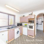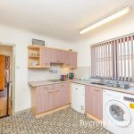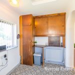 KITCHEN 11' 1" x 9' 11" (3.38m x 3.02m) u-shaped worktop with range of base cupboards and drawers including space for fridge; space for washing machine; space for upright oven; space for microwave; one bowl sink with mixer tap; radiator; side window; range of wall units including end shelf display unit; door to: