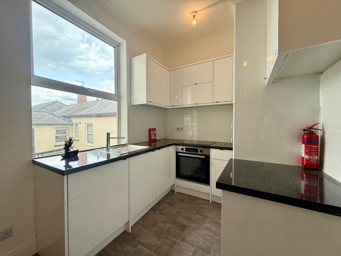 KITCHEN/DINER/LOUNGE 15' 8" x 10' 10" (4.78m x 3.3m) newly fitted kitchen with worktops with range of base cupboards and drawers; built-in Beko oven; four ring hob; one bowl sink with mixer tap; integrated washer/dryer; space for upright fridge/freezer; range of wall units; window to rear aspect.