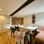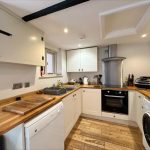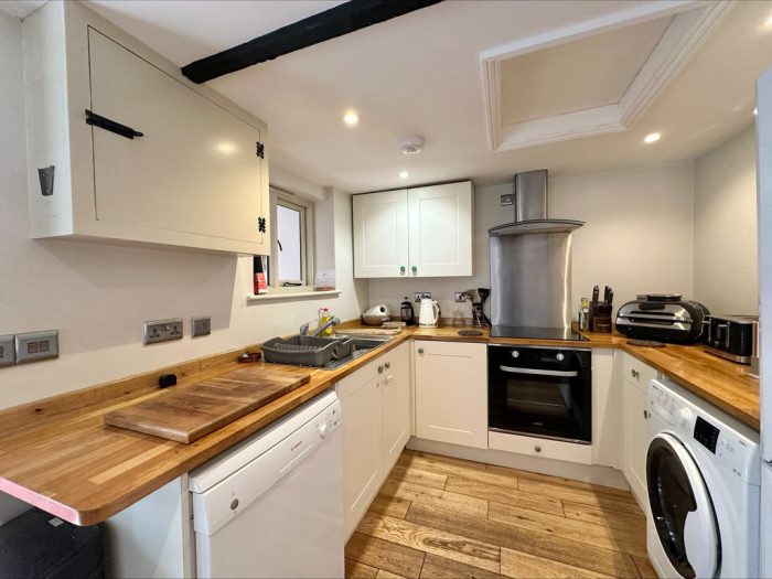 KITCHEN/DINER 19' 3" x 14' 8" max (5.87m x 4.47m) kitchen area fitted with a range of wall and base units with wide wood worksurfaces over; inset stainless steel single drainer sink; inset electric hob with stainless steel splashback and cooker hood over; built-in electric oven; plumbing for washing machine; plumbing for dishwasher; space for fridge/freezer; loft access. Dining area with double glazed window to front; feature brick and flint walls; built-in storage cupboard; exposed feature beam.