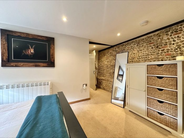 BEDROOM 2 10' max x 8' 1" (3.05m x 2.46m) double glazed window to front; feature beams and flint wall.