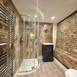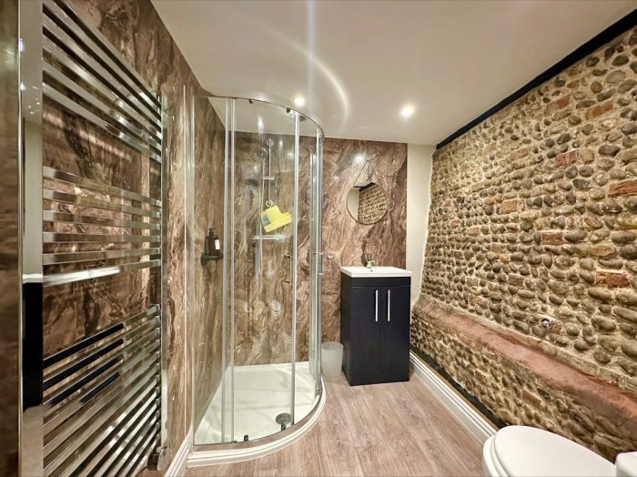 SHOWER ROOM 7' 2" x 5' 7" (2.18m x 1.7m) fitted with a suite comprising vanity hand wash basin with mixer tap over and storage cupboard below; low level wc; corner quadrant shower cubicle with sliding shower screen doors and wall mounted shower unit; Aqua board wall coverings; feature brick and flint wall; heated towel rail/radiator; extractor fan.