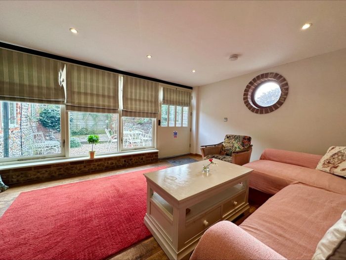 SITTING ROOM 13' 11" x 11' 9" (4.24m x 3.58m) double glazed window to side; double glazed door to side; porthole window to front; feature exposed flint wall.