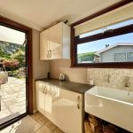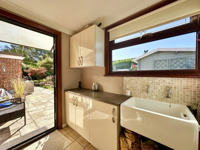 UTILITY ROOM 9' 1" x 6' max (2.77m x 1.83m) fitted with a range of wall and base units with roll edge worksurfaces over; Butler sink; plumbing for washing machine; upvc double glazed window to rear; upvc double glazed door to side.