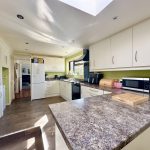 KITCHEN 20' 10" x 8' 11" max (6.35m x 2.72m) split over two levels and fitted with a range of wall and base units with roll edge worksurfaces over; inset stainless steel sink one and a half bowl sink with mixer tap over; space for electric cooker with electric cooker point; cooker hood over; tiled splashbacks; integrated dishwasher; roof lantern window; floor mounted oil fired central heating boiler; built-in airing cupboard.