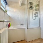 BATHROOM 8' 5" x 5' 7" max (2.57m x 1.7m) fitted with a white suite comprising of a vanity wash basin with mixer tap over and storage cupboard below; low level wc; panelled bath with mixer tap, shower screen and electric shower unit over; Aqua board and tiled splashbacks; wall mounted bathroom units; upvc double glazed window to rear.