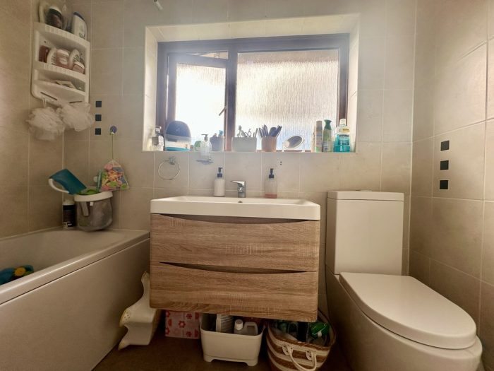 BATHROOM wc; vanity unit with wash hand basin, mixer tap and storage drawers; bath with chrome mixer tap and shower attachment; fully tiled walls; radiator; frosted window; extractor fan.