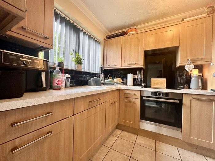 KITCHEN 11' 11" x 7' 11" (3.63m x 2.41m) l-shaped worktop with a range of base cupboards and drawers; built in oven with four ring hob; ceramic bowl and a half sink with mixer tap; further worktop with cupboards and drawers under; space for American style fridge freezer; range of wall units including light and extractor; tiled flooring; window to rear aspect; opening to Dining Room.
