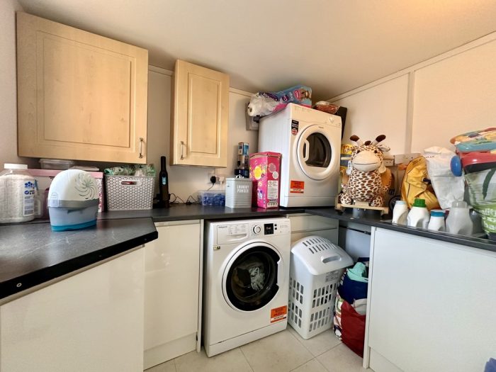 UTILITY / LAUNDRY ROOM 7' 9" x 5' 9" (2.36m x 1.75m) u-shaped worktop with base and wall units; sink unit; space and plumbing for washing machine; space for tumble dryer; frosted window.