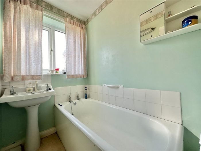 BATHROOM 6' 5" x 4' 5" (1.96m x 1.35m) fitted with a white suite comprising of a pedestal wash hand basin; panelled bath; tiled splashbacks; UPVC double glazed window to side.