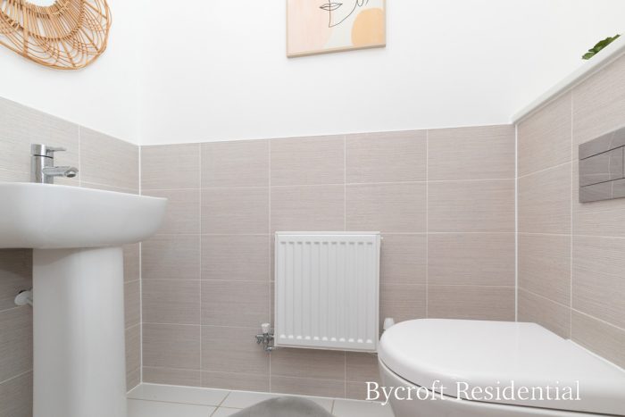 CLOAKROOM wc with concealed cistern; pedestal wash hand basin; half tiled walls; tiled flooring; radiator; frosted window.