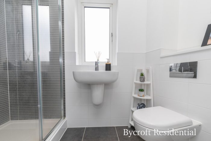 EN SUITE SHOWER ROOM large shower cubicle with Mira electric shower; wash hand basin; wc with concealed cistern; frosted window; half tiled walls; tiled flooring; chrome heated towel rail; downlights.