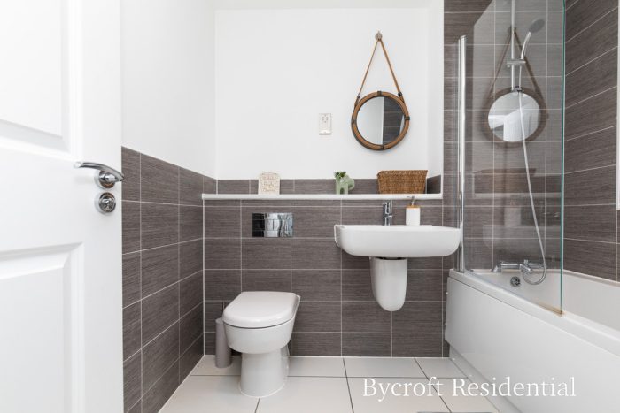 BATHROOM bath with mixer tap and shower attachment; wash hand basin; wc with concealed cistern; half tiled walls; tiled flooring; chrome heated towel rail; downlights; shaver point; extractor fan; frosted window.