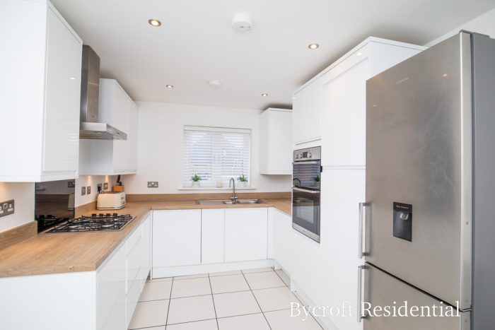 KITCHEN / DINER 16' 9" x 9' 1" (5.11m x 2.77m) beautifully fitted with a range of white high gloss wall and base units with u-shaped worktop; built in eye level Indesit oven and grill; four ring gas hob with light and extractor; integrated dishwasher and washing machine; one and a half bowl sink; cupboard housing Valiant gas boiler; space for upright fridge freezer; windows to front and side aspects; tiled flooring; radiator; downlights; further rear window and door out to rear garden.