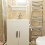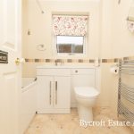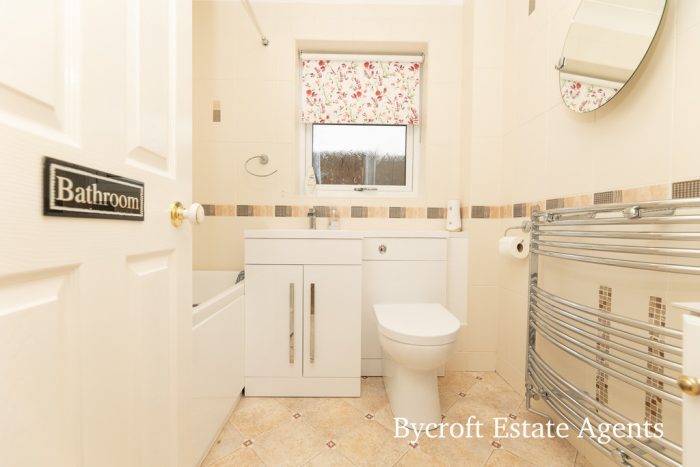 BATHROOM vanity unit comprising wash hand basin with mixer tap and double cupboard under; wc with concealed push button cistern; bath with mains shower fittings; fully tiled walls; frosted window; chrome heated towel rail.