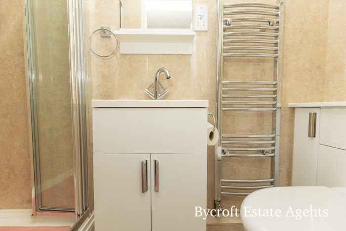 EN SUITE shower cubicle with Triton fittings; vanity unit comprising wash hand basin with mixer tap and double cupboard under; wc with concealed push button cistern; heated towel rail; shaver point; extractor fan.