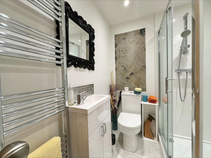 EN SUITE 5' 10" x 5' 7" (1.78m x 1.7m) fitted with a white suite comprising of a vanity wash hand basin with mixer tap and storage cupboards; low level wc; walk in shower cubicle with wall mounted shower; aquaboard and tiled splashbacks; heated towel rail radiator; electric under floor heating; extractor fan.