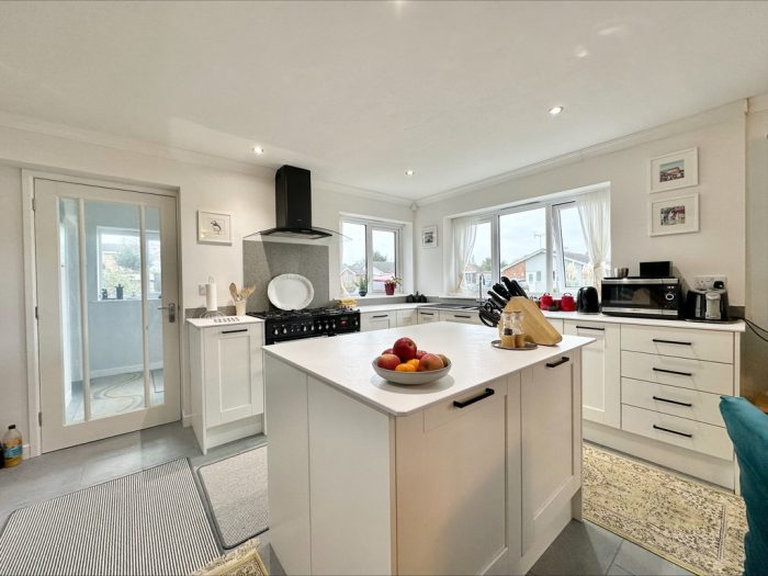 OPEN PLAN KITCHEN / DINING / LIVING 23' 10" x 14' 4" max (7.26m x 4.37m) kitchen area - fitted with a range of base units with square worksurfaces over; inset one and a half bowl sink with mixer tap; water softner; integrated dishwasher; space for dual fuel (electric and LPG gas (via gas bottles)) five ring range cooker with quartz splashback and cooker hood over; space for American style fridge freezer; pull out larder cupboard; central island unit; UPVC double glazed window to side; two UPVC double glazed windows to front.