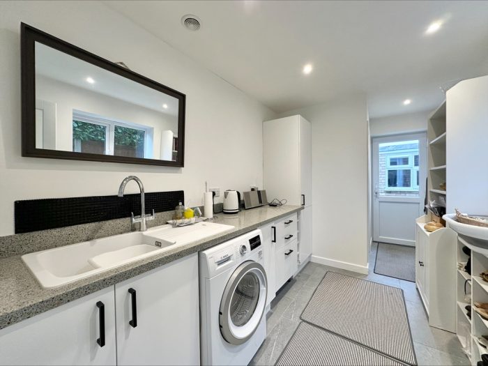 UTILITY ROOM 7' 2" max x 14' 9" max (2.18m x 4.5m) UPVC double glazed window to side; UPVC double glazed door to rear; fitted with a range of base units with quartz worksurfaces over; inset single drainer sink with mixer tap; plumbing for automatic washing machine; feature wine rack.