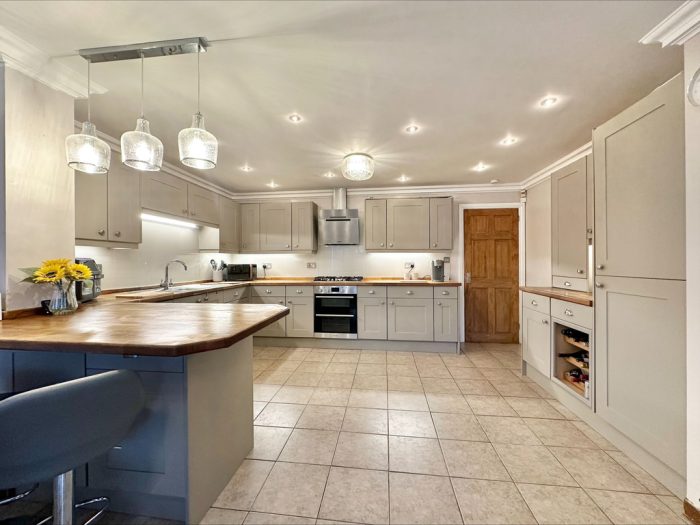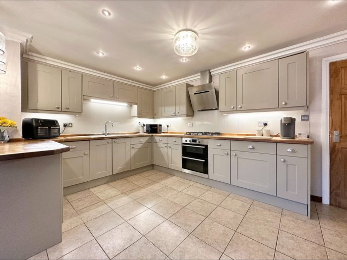 OPEN PLAN KITCHEN / DINING / LIVING SPACE 21' 7" x 14' 10" max (6.58m x 4.52m) Kitchen Area - fitted with a range of wall and base units with roll edge worksurfaces over; inset one and a half bowl stainless steel sink with mixer tap; integrated dishwasher; bin drawer; built in double electric oven; inset five ring LPG gas hob with cooker hood over; peninsula breakfast bar; tiled flooring; radiator.