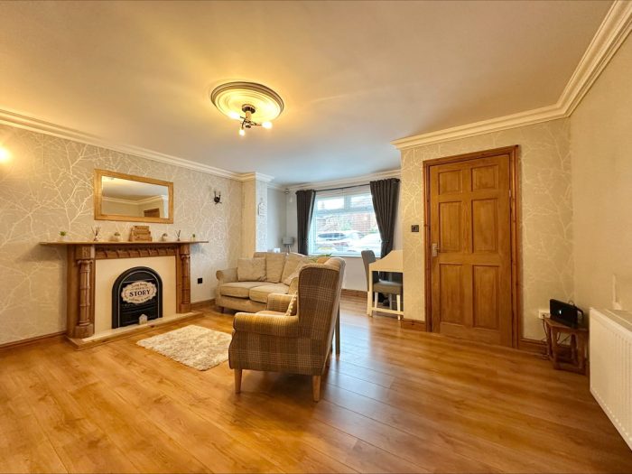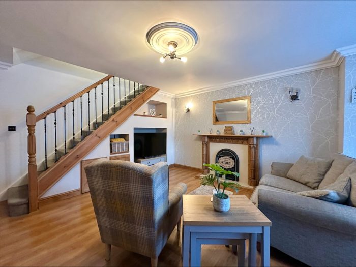 SITTING ROOM 14' 11" max x 18' 5" max into bay minus stairwell (4.55m x 5.61m) UPVC double glazed bay window to front; understairs storage cupboard; understairs recessed shelving; feature fireplace with inset electric fire (decorative purposes only) and decorative surround; radiator.