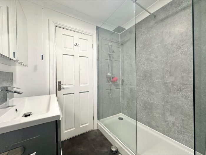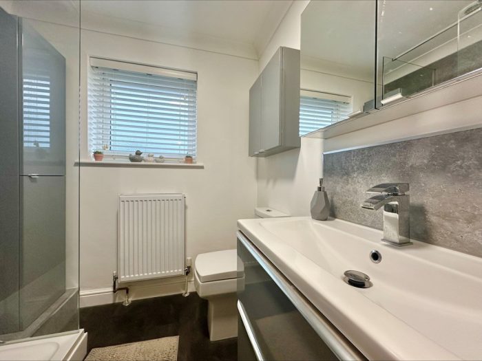 SHOWER ROOM 6' 4" x 6' 6" (1.93m x 1.98m) fitted with a white suite comprising of a double width vanity wash hand basin with mixer tap; low level wc; walk in shower cubicle with screen, aquaboard wall coverings and wall mounted shower unit with hand and soaker attachments; UPVC double glazed window to rear; extractor fan; radiator.