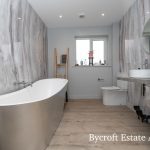 FAMILY BATHROOM 9' 7" x 7' 5" (2.92m x 2.26m) fitted with a white suite comprising of a low level wc; circular vanity hand wash basin with mixer tap and storage drawer; freestanding slipper style bath with mixer tap; UPVC double glazed window to rear; extractor fan.