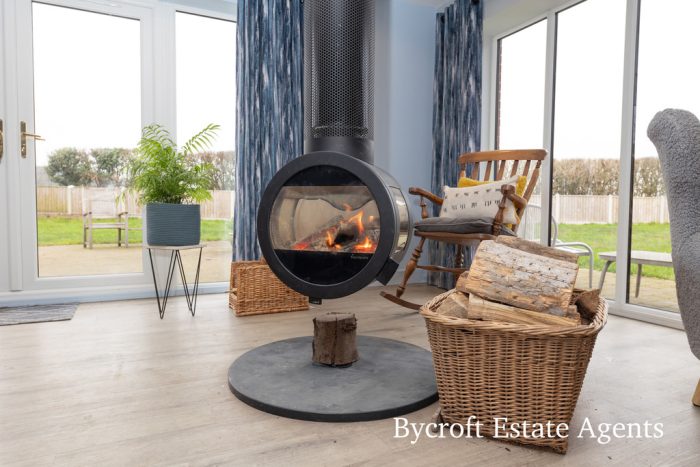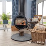 Living area - floating circular wood burning stove with circular hearth; built in TV media wall with inset speaker system