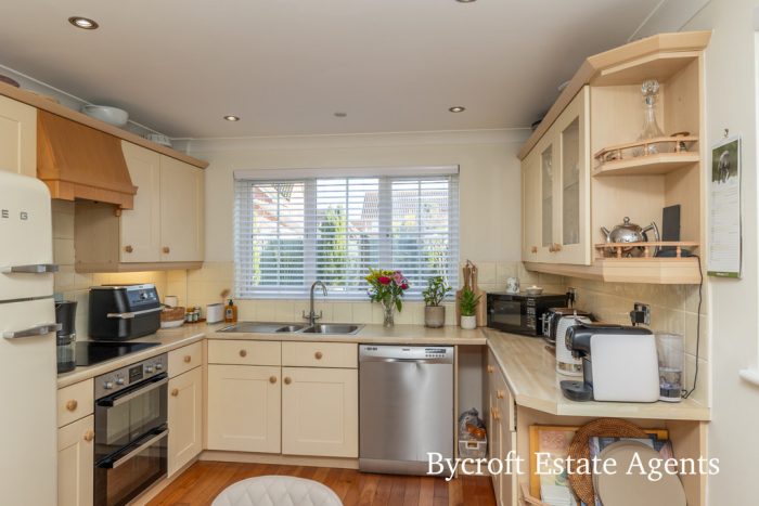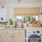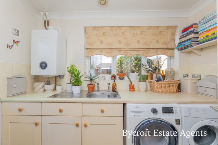 UTILITY 9' 3" x 5' 8" (2.82m x 1.73m) full length worktop with base cupboards and drawers; one bowl sink; tiled splashback; space and plumbing for washing machine; space for tumble dryer; window to front aspect; recently installed (2023) Worcester gas boiler; tiled flooring; further built in shelved upright unit; downlights; extractor fan; side door.