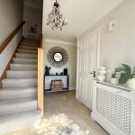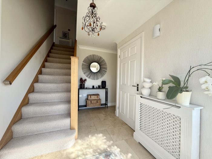 SPACIOUS ENTRANCE HALL entrance door with fixed frosted glazed side panels; oak staircase to first floor; radiator; tiled flooring.