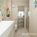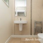 CLOAKROOM wc; wash hand basin with mixer tap; part tiled walls; chrome heated towel rail; downlights; frosted window.